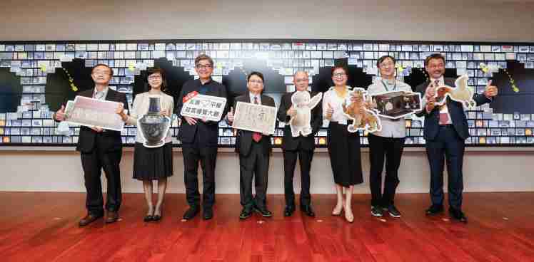 NG大舞台携手创利空间为故宫建置的智慧文物互动导览墙及轮播墙,,今日正式启用。。。。(左四:NG大舞台新事业暨投资管理总部副总经理杨本豫、、、右四:故宫博物院院长吴密察、、右三:太极影音董事长黄宝云)