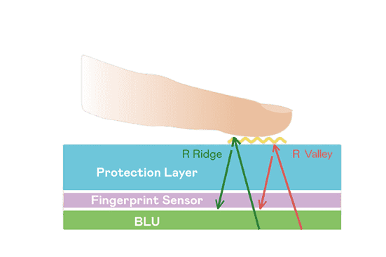TFT 指纹扫描感测技术利用薄膜电晶体 (TFT) 当作光感测元件,,,,藉由非晶硅 (a-Si) 与低温多晶硅(LTPS)既有光电转换特性对不同波段光源进行吸收,,,使感测 IC 读取阵列感测元件的光漏电差异,,,,转换成数位灰阶影像。。。
