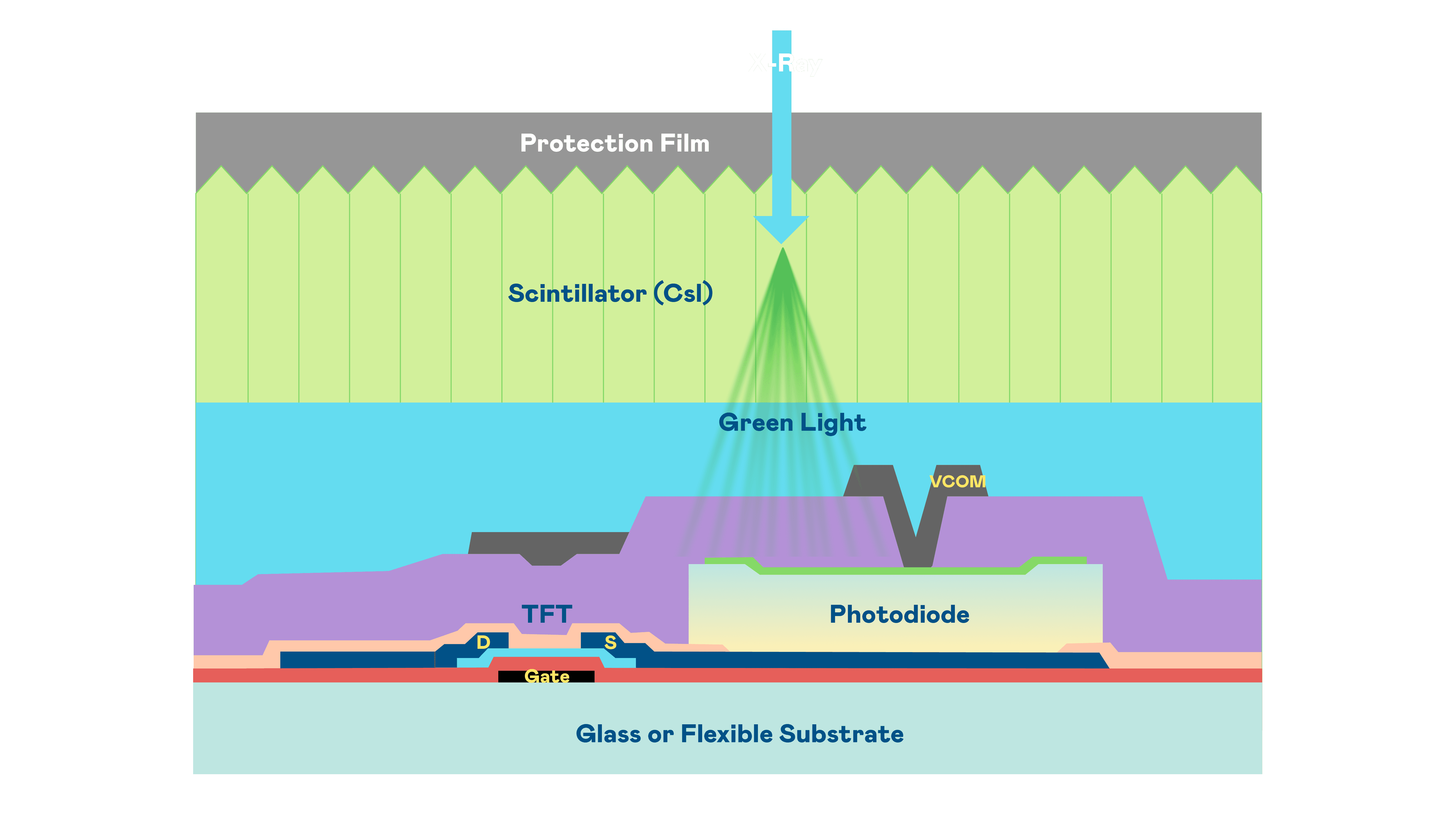 NG大舞台的X光影像感测阵列使用薄膜电晶体 (TFT) 作为每个像素的读取开关,,,搭配光电二极体(Photodiode)的光电转换元件,,用以感测X光影像讯号。。。。
